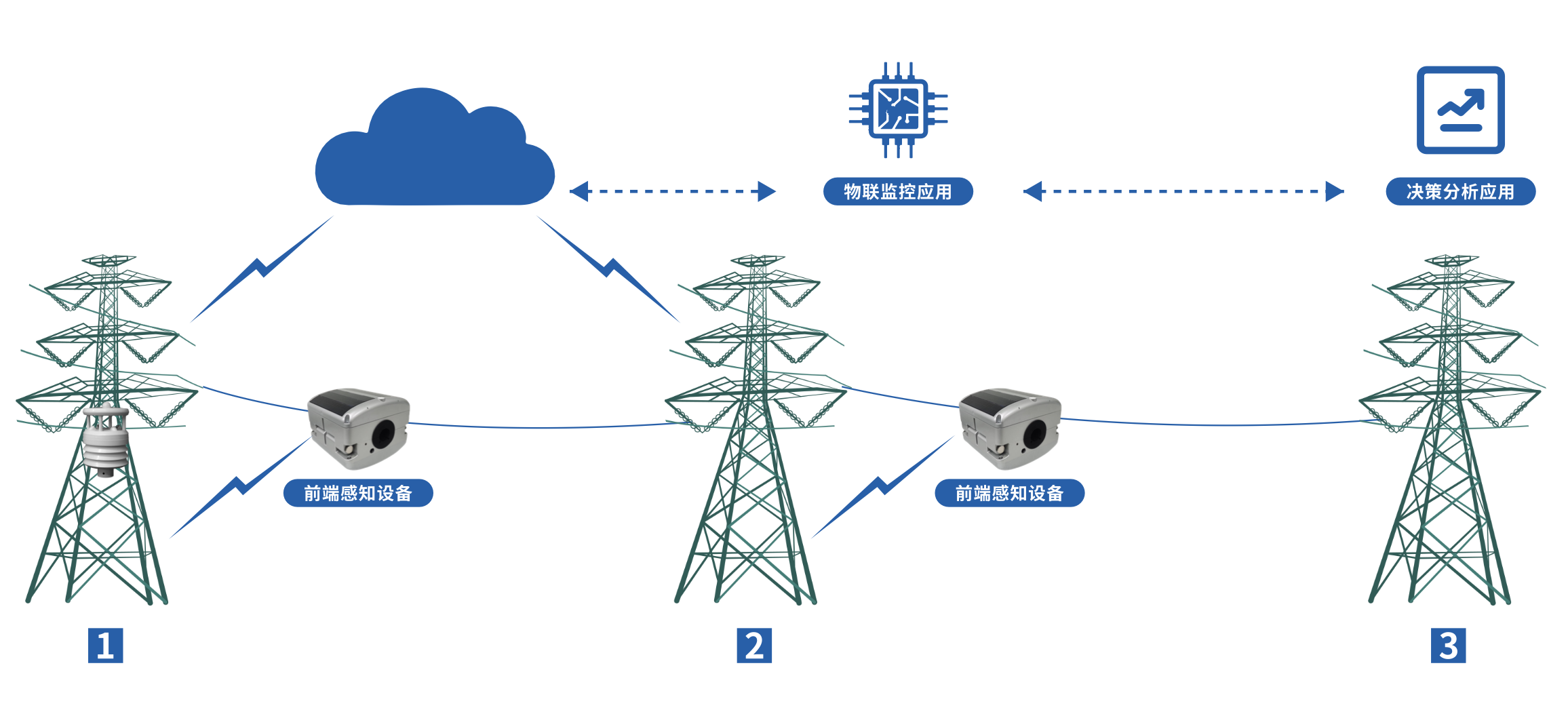 建议在线路出线的第1级基塔和线路最后1级基塔上各装1套(每套含三个导线精灵与一个微气象监测装置),另外在线路的每个交叉跨越档、典型气象区以及重点监测档上各安装 1套,并在中间其余节点安装若干套,以保证理想效果。一般建议系统在正常工作时以每5分钟一次的频率采集并上传监测数据,在预警状态时转为每分钟一次。